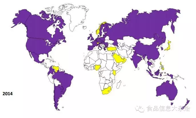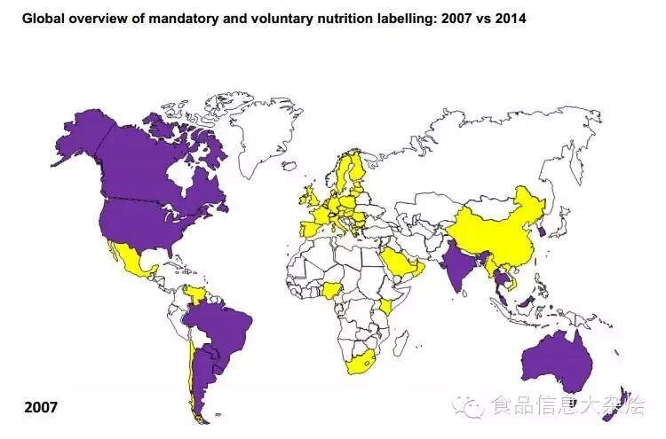 上述两图中紫色部分代表强制标示营养标签的国家和地区,黄色部分代表自愿标示营养标签的国家和地区(声称强制或特殊膳食食品强制),白色部分则是没有法规的国家和地区。单从面积上看,从2007年到2014年,短短几年之内,强制标示营养标签的国家的覆盖面已经大大增加,目前已占了全球约2/3的地区。我们国家2007年时还在黄色区域,现在到了紫色区域了(自豪感油然而生啊!)
